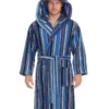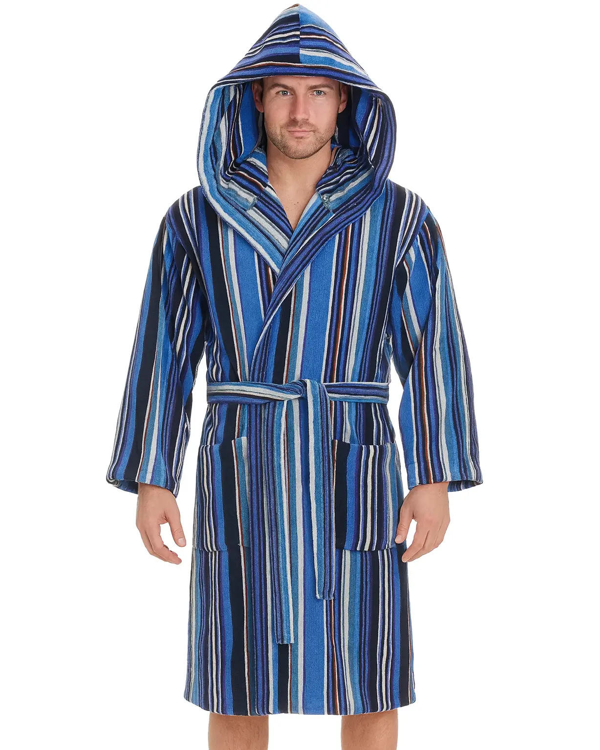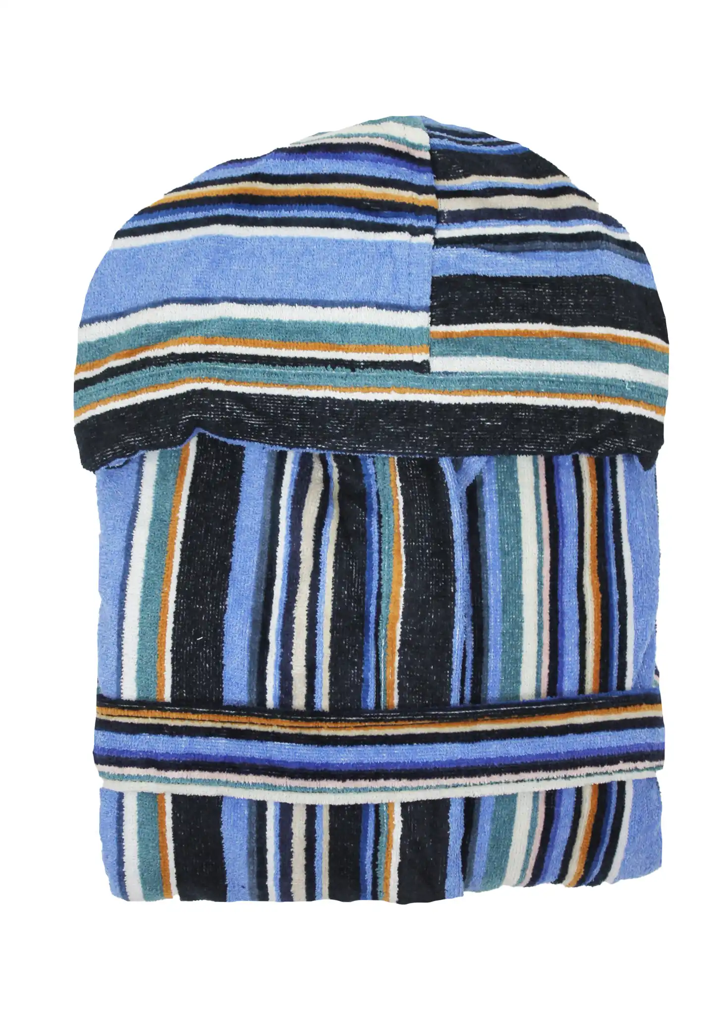 Decorato in “stile Missoni”, con fantasia cucita a righe longitudinali . L’accappatoio ha ampio cappuccio, tasche laterali e cintura in vita.