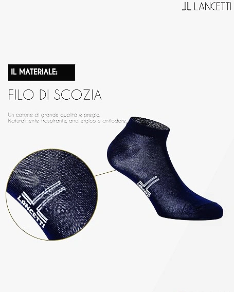 Con 3% di elastan per vestibilità e resistenza. Elasticizzati ed aderenti al piede , ma senza stringere con bordino antistress. Filo di scozia corto giro scarpa e massima freschezza. Bordino superiore a nido d’ape per non stringere