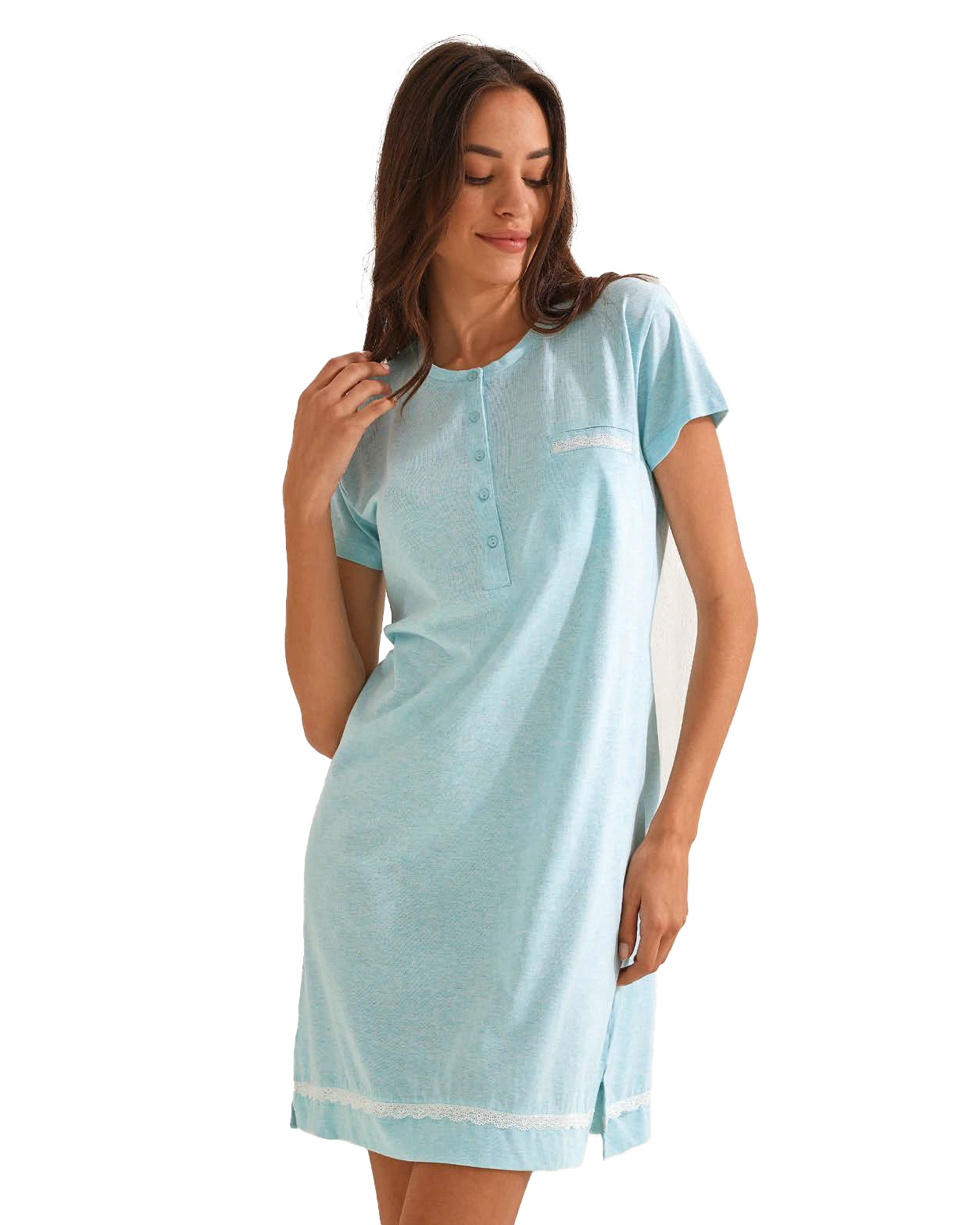 Mezza manica e lunga fin sopra le ginocchia , con bordino applicato in pizzo e taschino sul petto sempre bordato in pizzo.