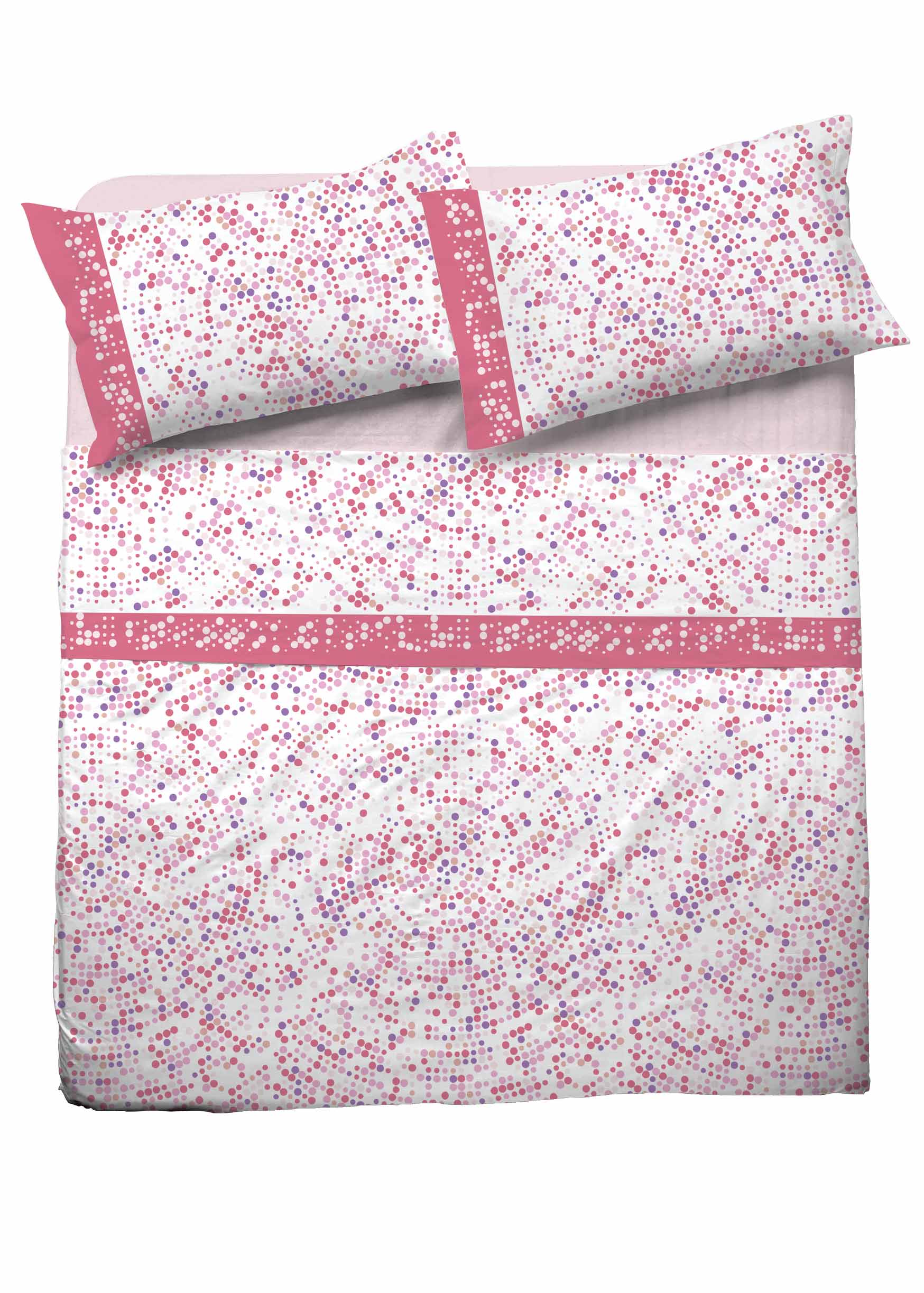 Completo letto 1 piazza e mezzo Venere di Novia, 100% in cotone, estremamente resistente, piacevole al tatto, fresco e facilmente lavabile. Disegno Piper rosa, adatto ad ogni stile d’arredamento.
