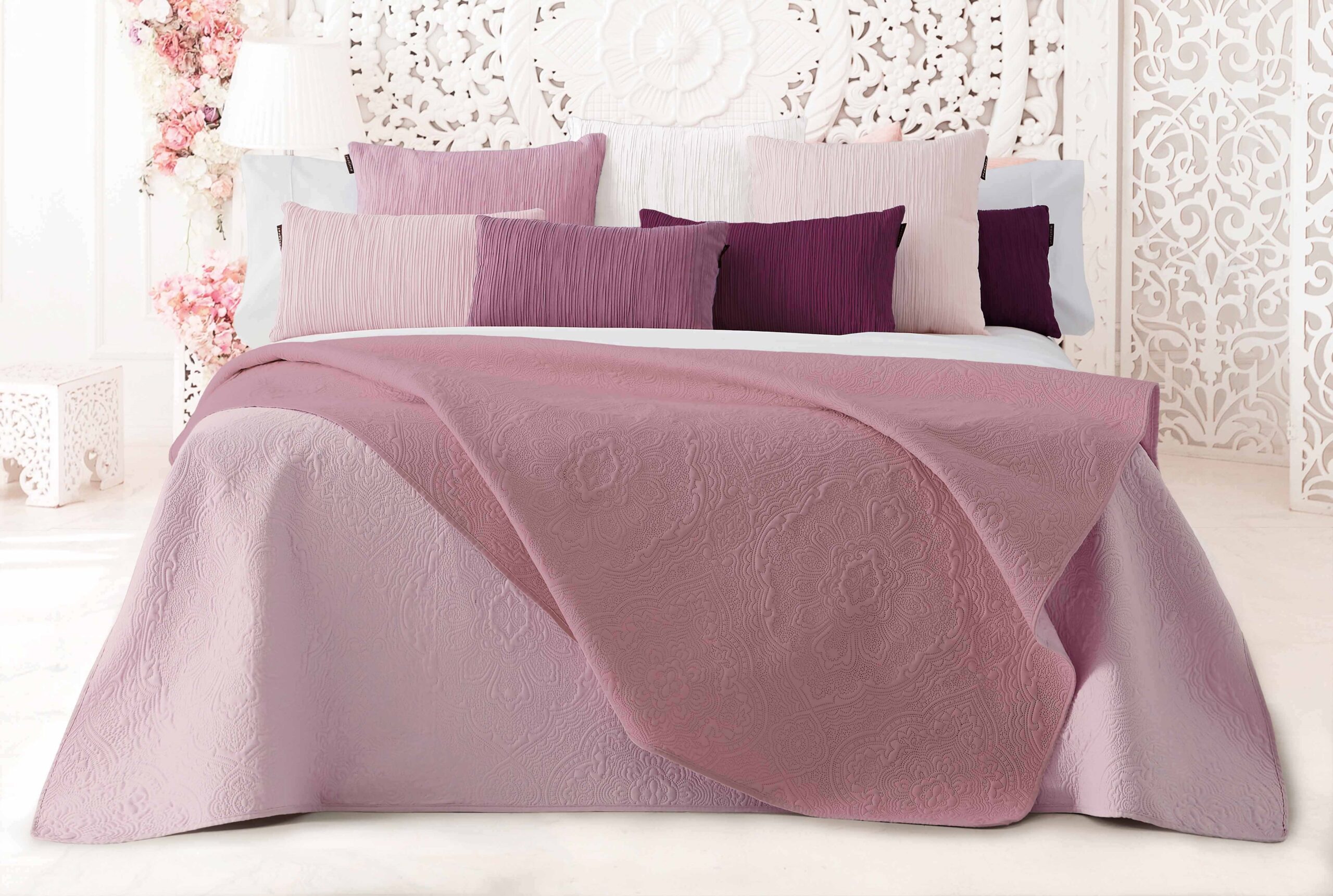 Double face, con fantasia Cipria su un lato e rosa pallido sull’altro. Leggera , adatta alla mezza stagione o come copriletto arredo.
