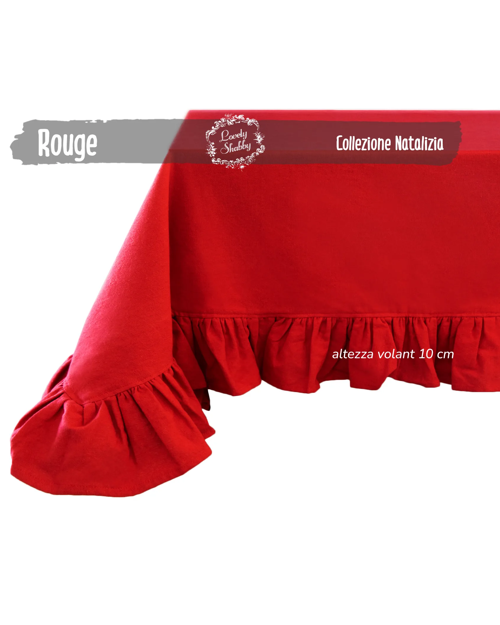 Realizzato in 100% cotone naturale, questo copritavolo è caratterizzato da un vivace colore rosso natalizio e da un volant decorativo di 10 cm che aggiunge un tocco raffinato e romantico allo stile shabby chic tipico del marchio Lovely Shabby.