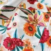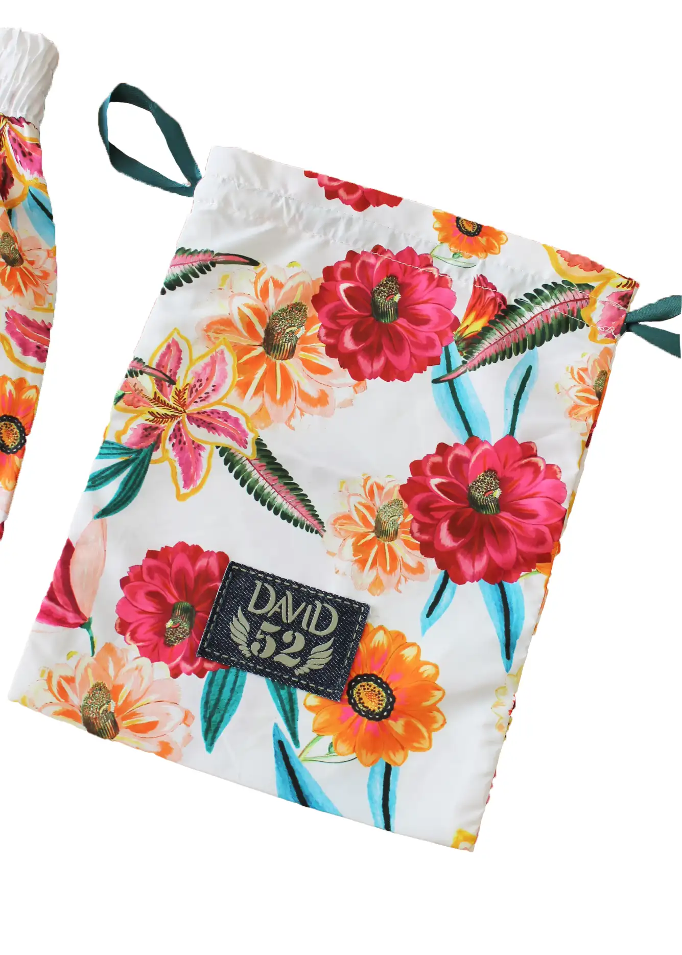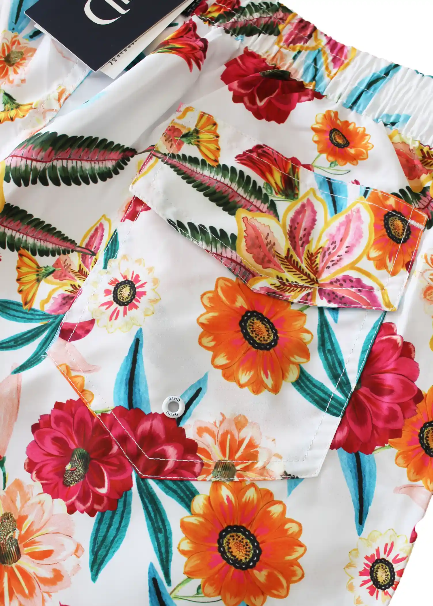 Modello corto, con retina interna e morbida fodera coprente in taglio slip, tasche laterali e decorazione a stampa floreale in vivaci colori sui toni del rosso/arancio. Regolabile in vita da morbido elastico coperto con coulisse.