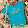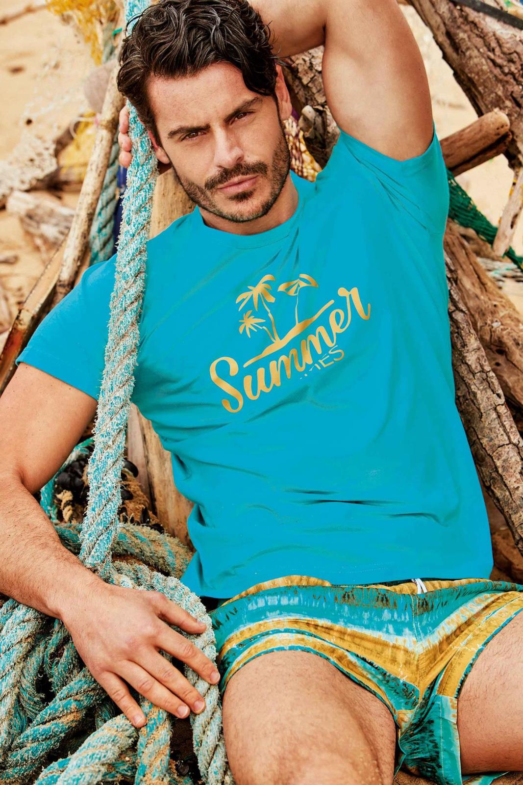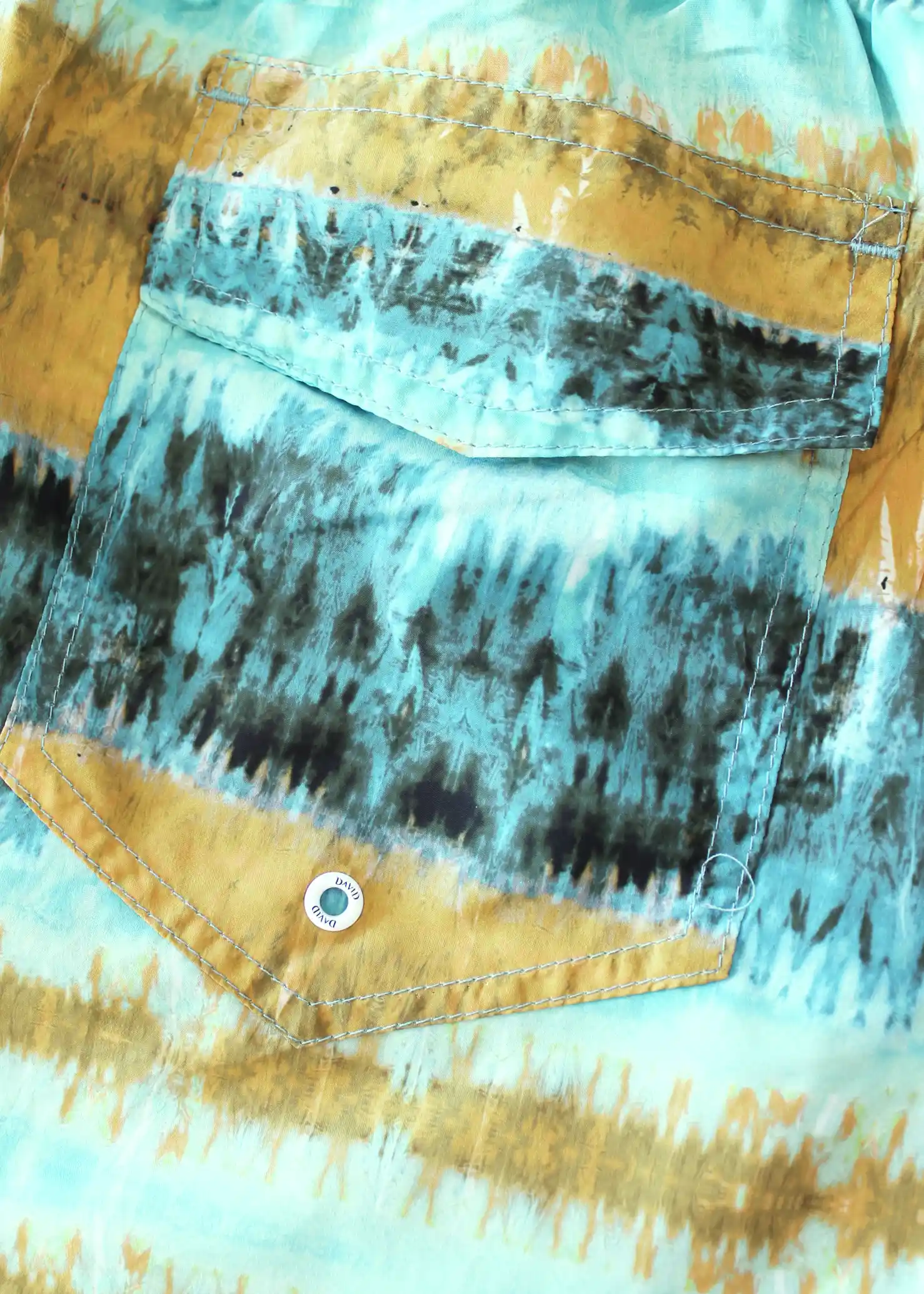 Modello corto, con retina interna e morbida fodera coprente in taglio slip, tasche laterali e decorazione a stampa in vivaci colori sui toni dell’azzurro. Regolabile in vita da morbido elastico coperto con coulisse.