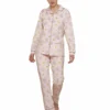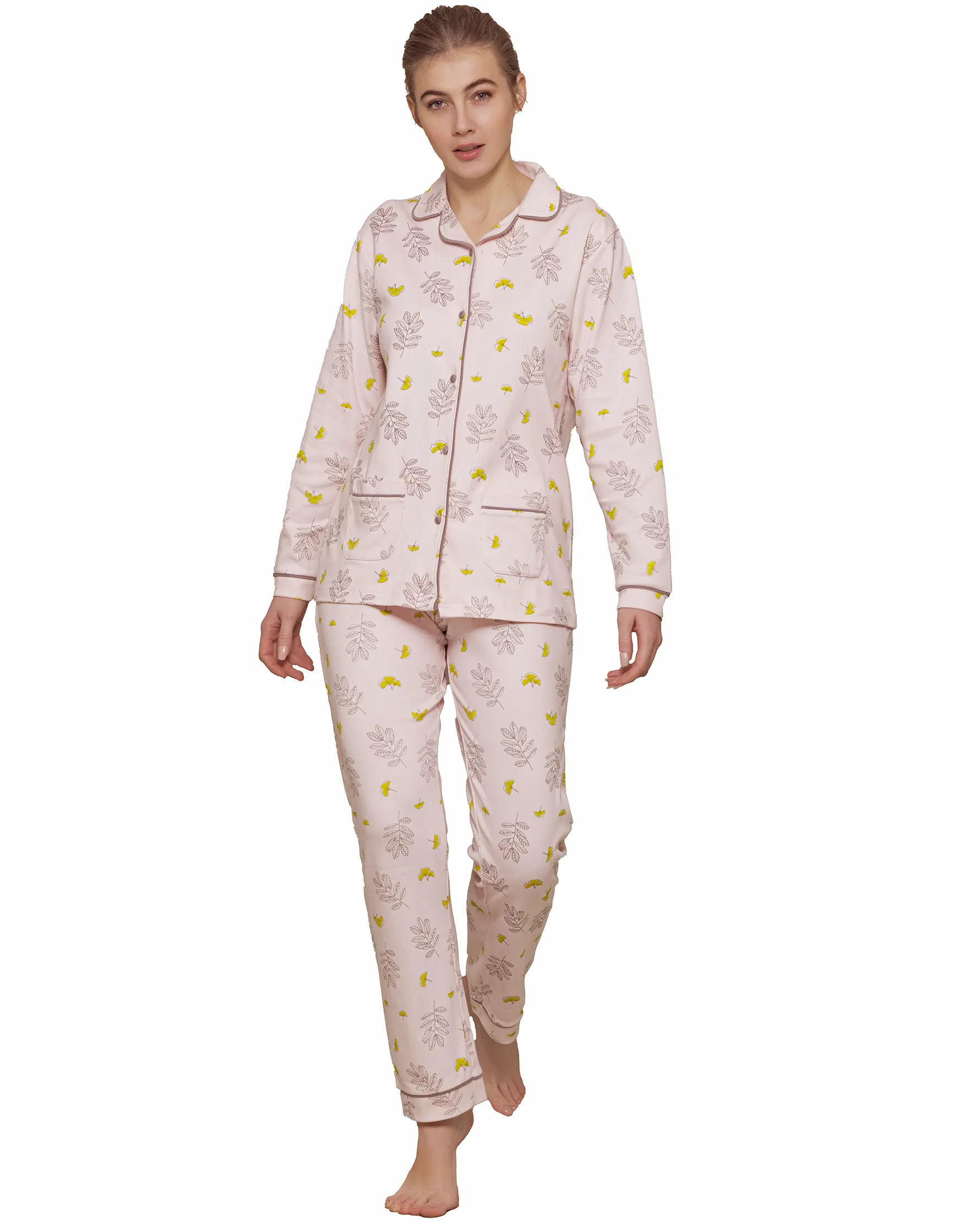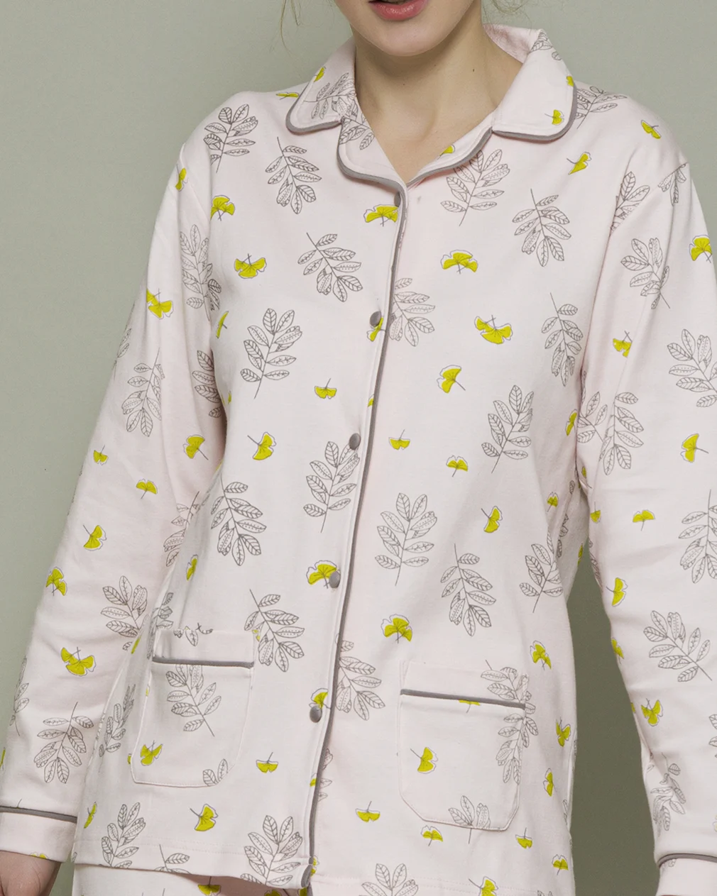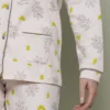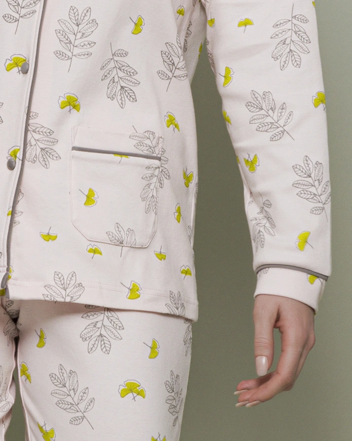 Pigiama donna rifinito minuziosamente con bordini a contrasto lungo maniche, colletto e aperura della maglia.