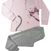 Colori disponibili: Azzurro, maglia con fondo azzurro e stampa con gattino, colletto, polsini azzurri e pantalone blu. Rosa, maglia con fondo rosa e stampa con bottini, polsini e bottoncini rosa e pantalone grigio.