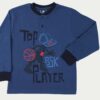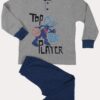 Colori disponibili: Grigio Melange, maglia con fondo grigio melange a tema basket con scritta “top player”, colletto, polsini e bottoncini blu e pantalone blu. Jeans, maglia con fondo jeans a tema basket con scritta “top player”, polsini e bottoncini blu scuro e pantalone blu scuro.