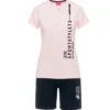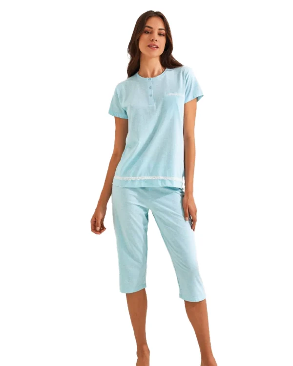 Pigiama donna in mezza manica e pantaloncino corto viene prodotto utilizzando 100% cotone leggero che risulta fino e traspirante e si adatta ai periodi più caldi dell’anno.