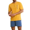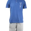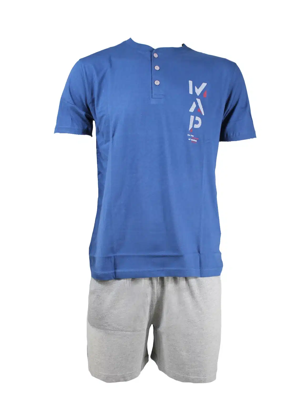 Disponibile in due colorazioni con stampa sul petto e fondo tinta unita Giallo oppure Bluette e nelle taglie dalla S/46 alla XXL/54. Maglia a mezza manica e pantaloncino corto sopra al ginocchio e realizzati totalmente in cotone fresco.