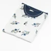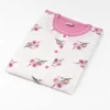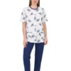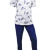Composto da giacca girocollo a manica corta completamente aperta con bottoncini e rifinitura, tasche anteriori con bordo rifinito, decorazione a stampa di coccinelle e pantalone lungo con polsino alla caviglia.