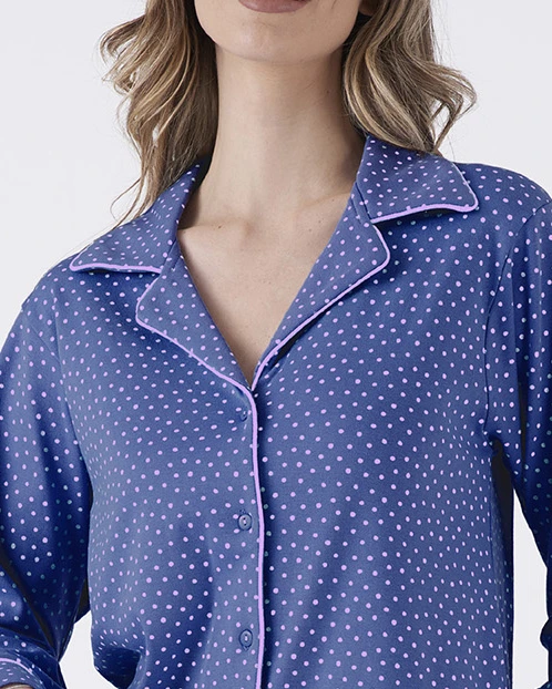 Attenzione ai dettagli come i bottoncini rifinito con tessuto in tinta e colletto reverse. Questo pigiama donna realizzato in 100% caldo cotone Interlock adatto all’autunno e all’inverno. Un tessuto traspirante e comodo a contatto sulla pelle ideale per un ottimo riposo nella stagione fredda.