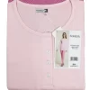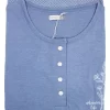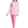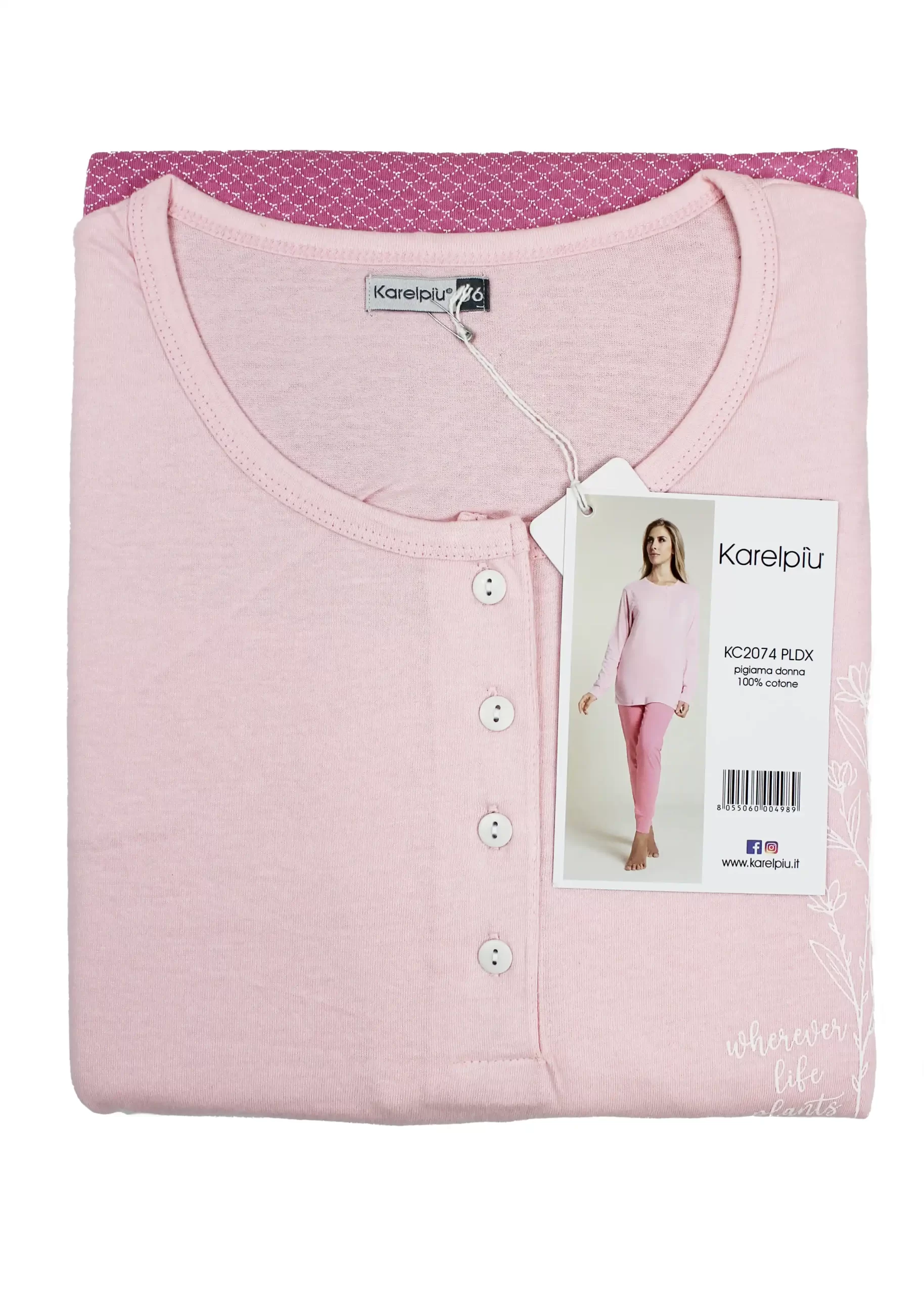 Maglia girocollo modello serafino a manica lunga decorata con piccola stampa laterale sul petto e 4 bottoncini, abbinata a pantalone a fantasia con polsini alla caviglia.