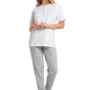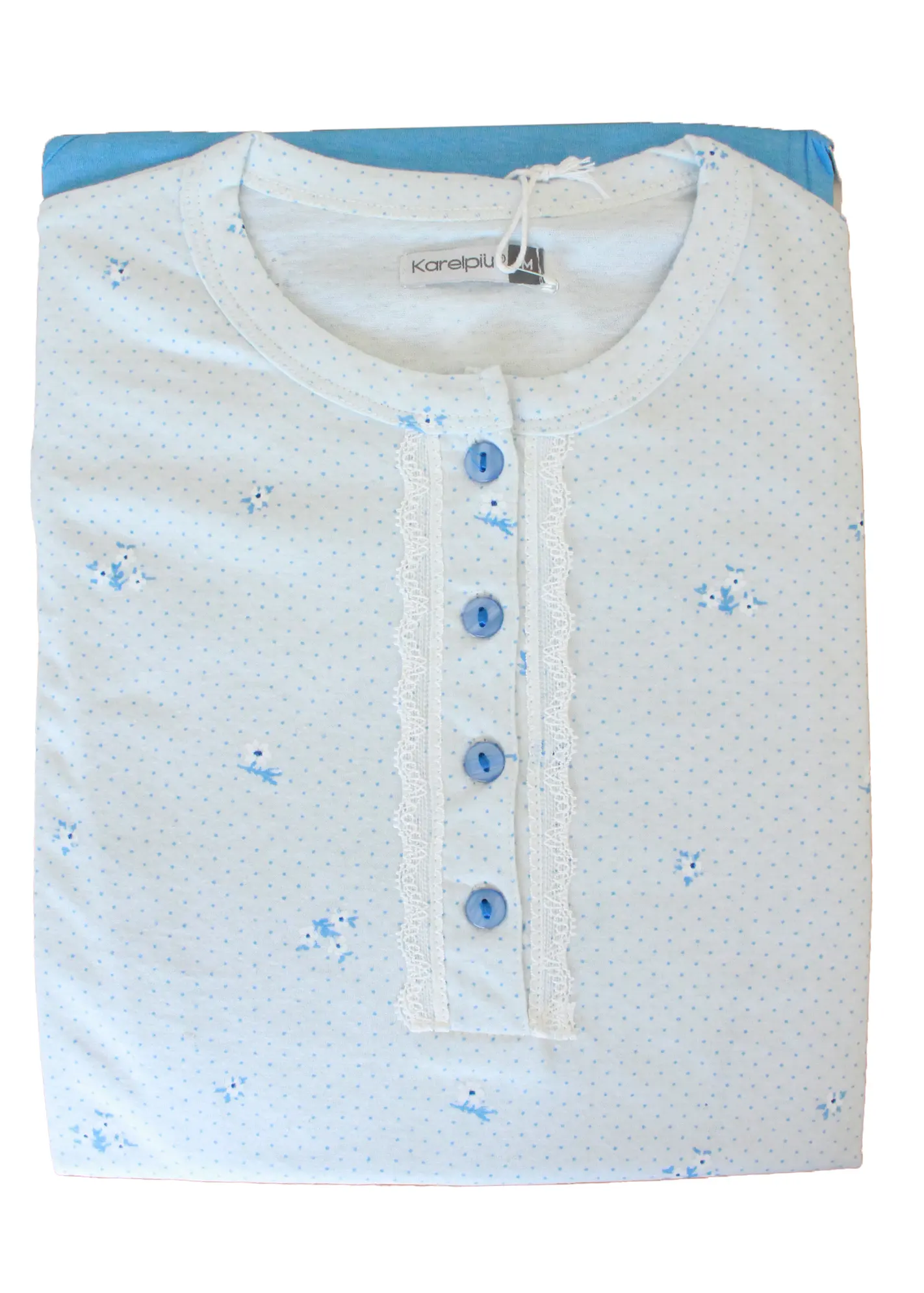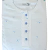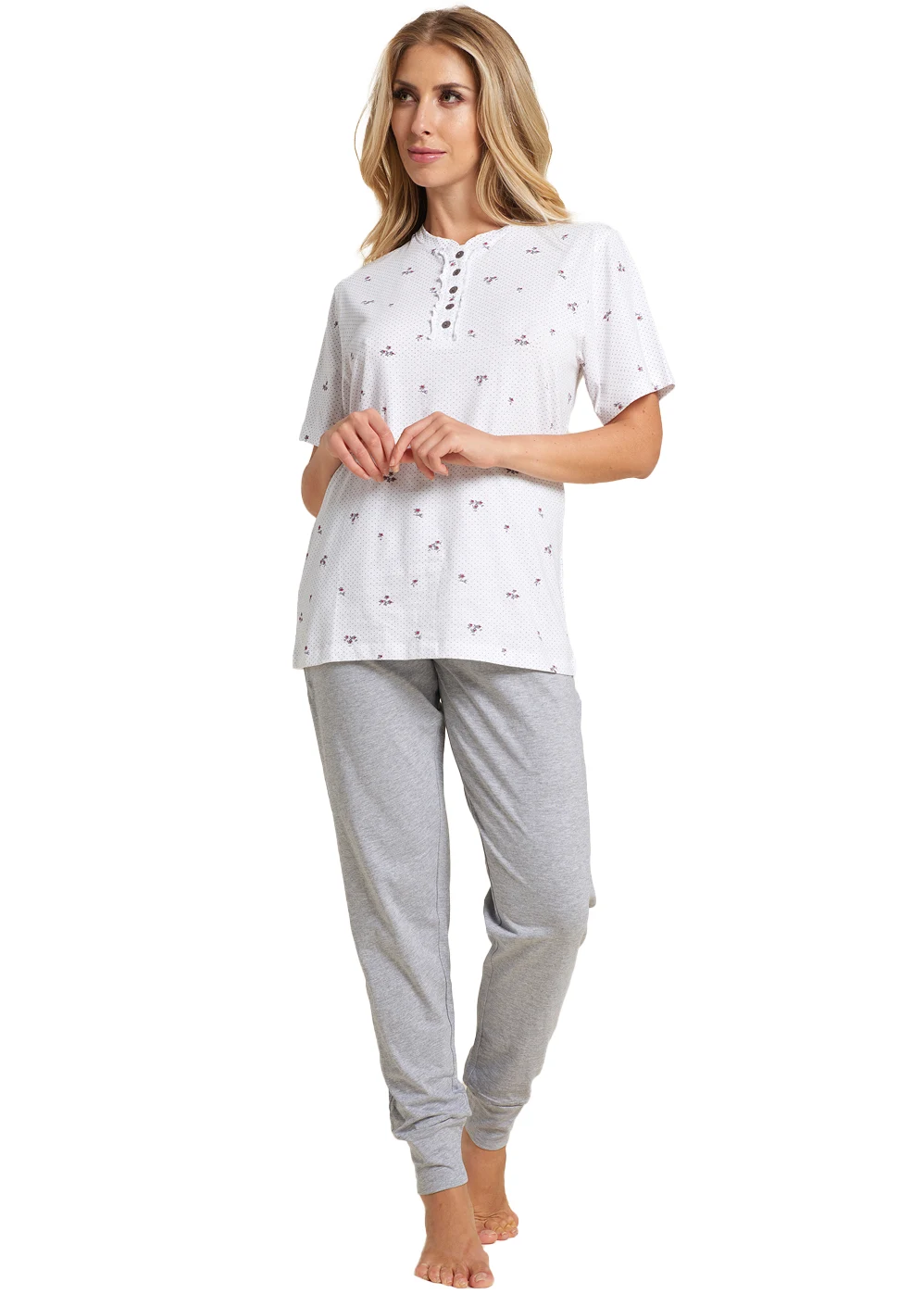 Composto da maglia a mezza manica dal taglio dritto, girocollo con quattro bottoncini ed elegante rifinitura, decorazione a fantasia floreale e pantalone lungo a tinta unita con polsini alla caviglia.