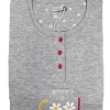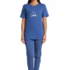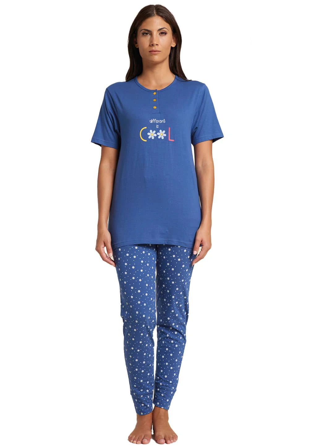 Con maglia girocollo modello serafino con tre bottoni, mezza manica, decorata a stampa con margherite e la scritta “Different is Cool”, abbinata a pantalone a fantasia floreale con polsini alla caviglia. Modello ambio e comodo, dall’eccezionale libertà di movimento e vestibilità.