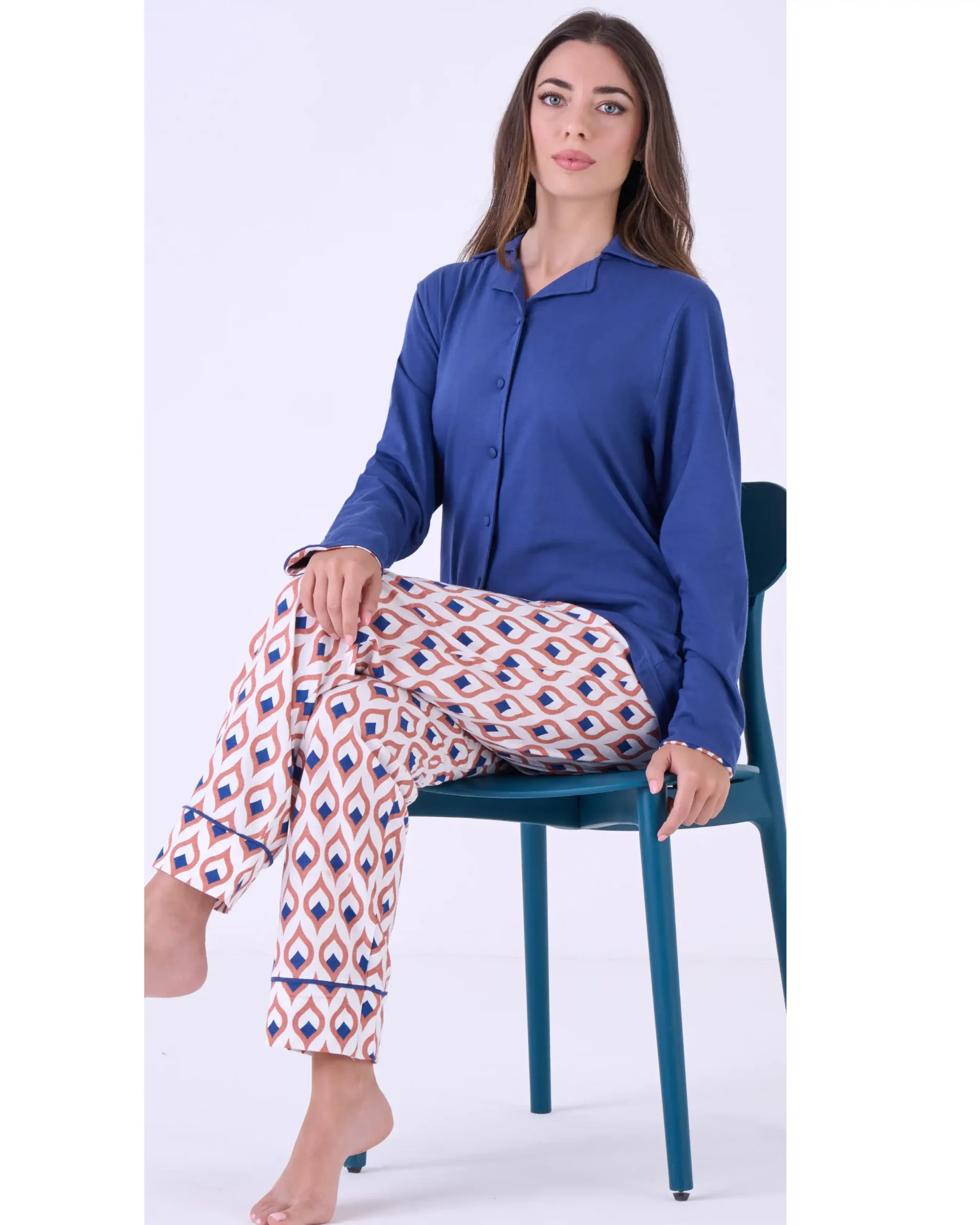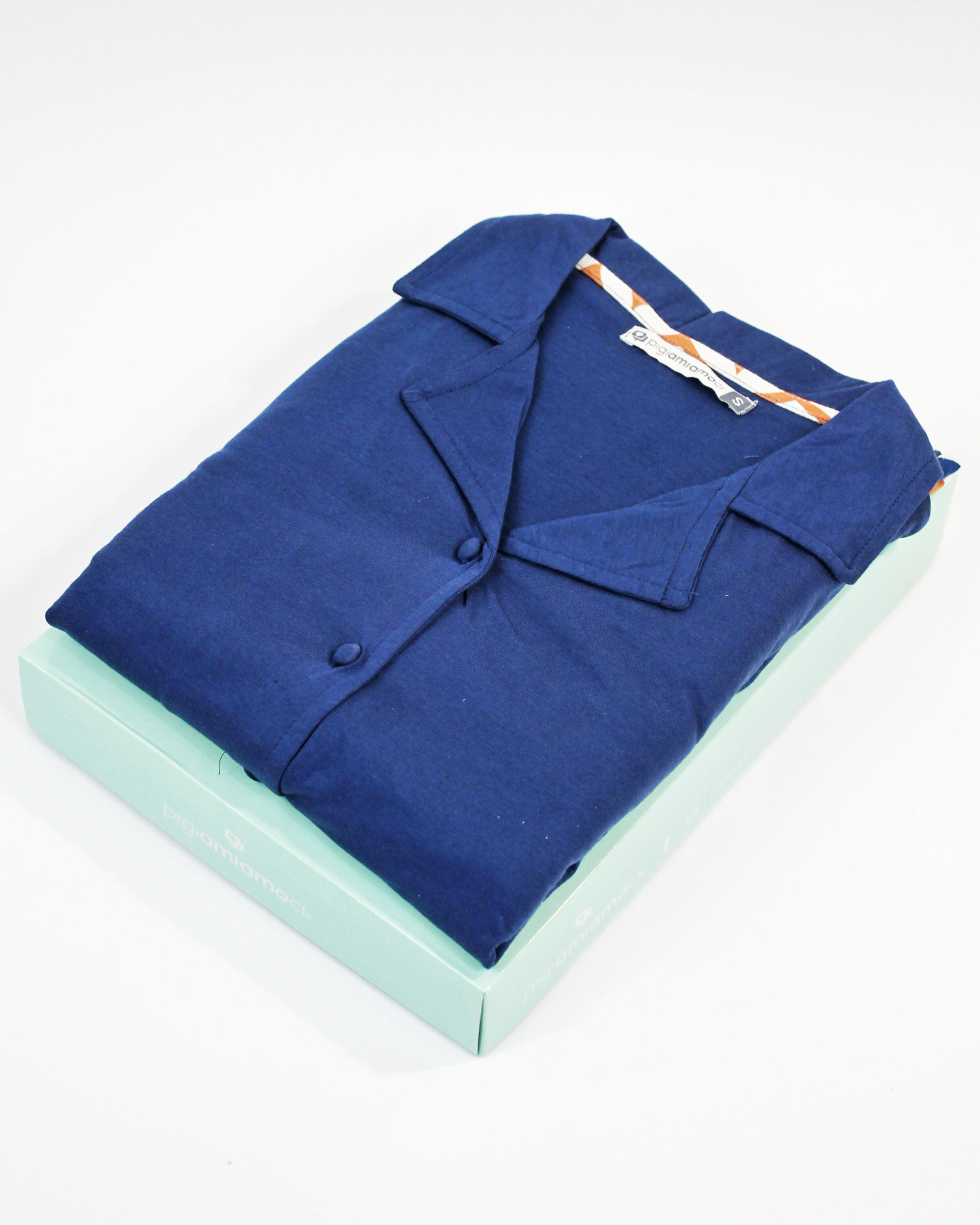 Attenzione ai dettagli come i bottoncini rifinito con tessuto in tinta e colletto reverse. Questo pigiama donna realizzato in 100% cotone jersey molto leggero e traspirante, un tessuto fino e comodo a contatto sulla pelle ideale per la stagione primavera estate.