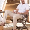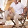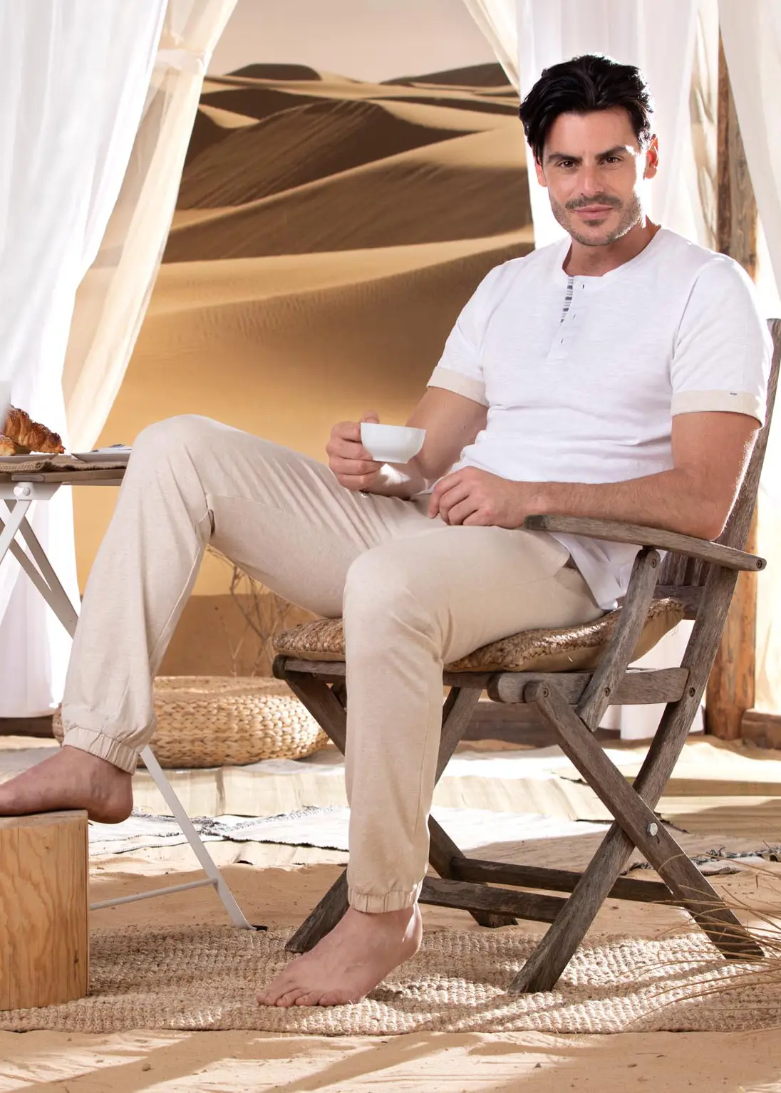 Dall’esclusivo Design, il pigiama è composto da casacca in fresco jersey fiammato, girocollo modello serafino con 3 bottoni, mezza manica con bordo color beige e pantalone lungo tinta unita con bordo elastico alla caviglia
