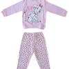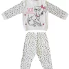 Composto da maglia girocollo decorata con stampa raffigurante un dolce dalmata e scritta “101 Dalmatians”, con glitter rosa, maniche lunghe con bordo elastico al polso decorate a macchie di dalmata stampate, e pantalone con polsini elastici alla caviglia decorato a macchie di dalmata stampate.