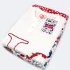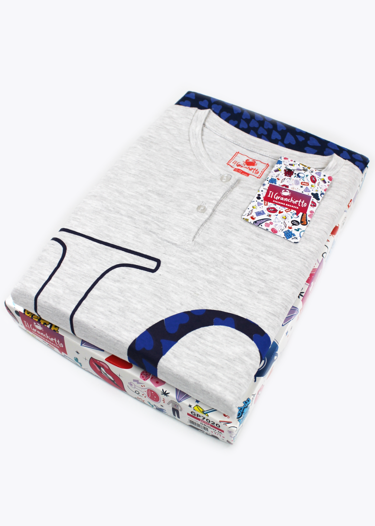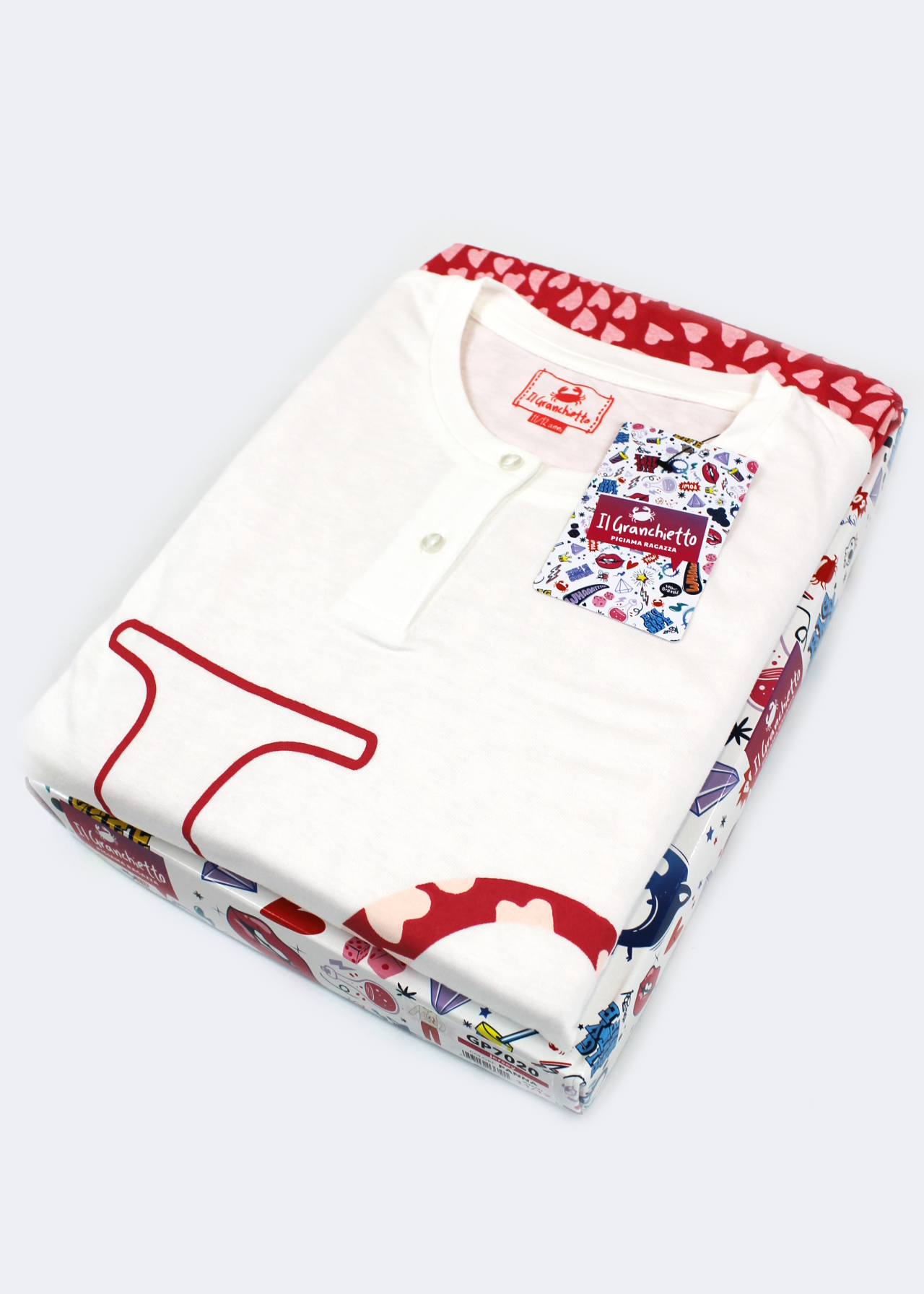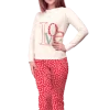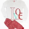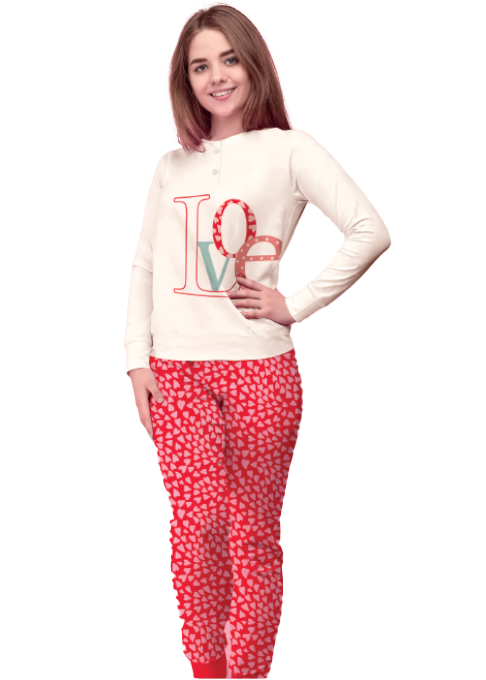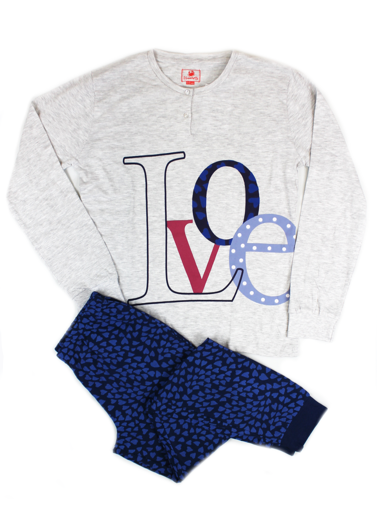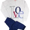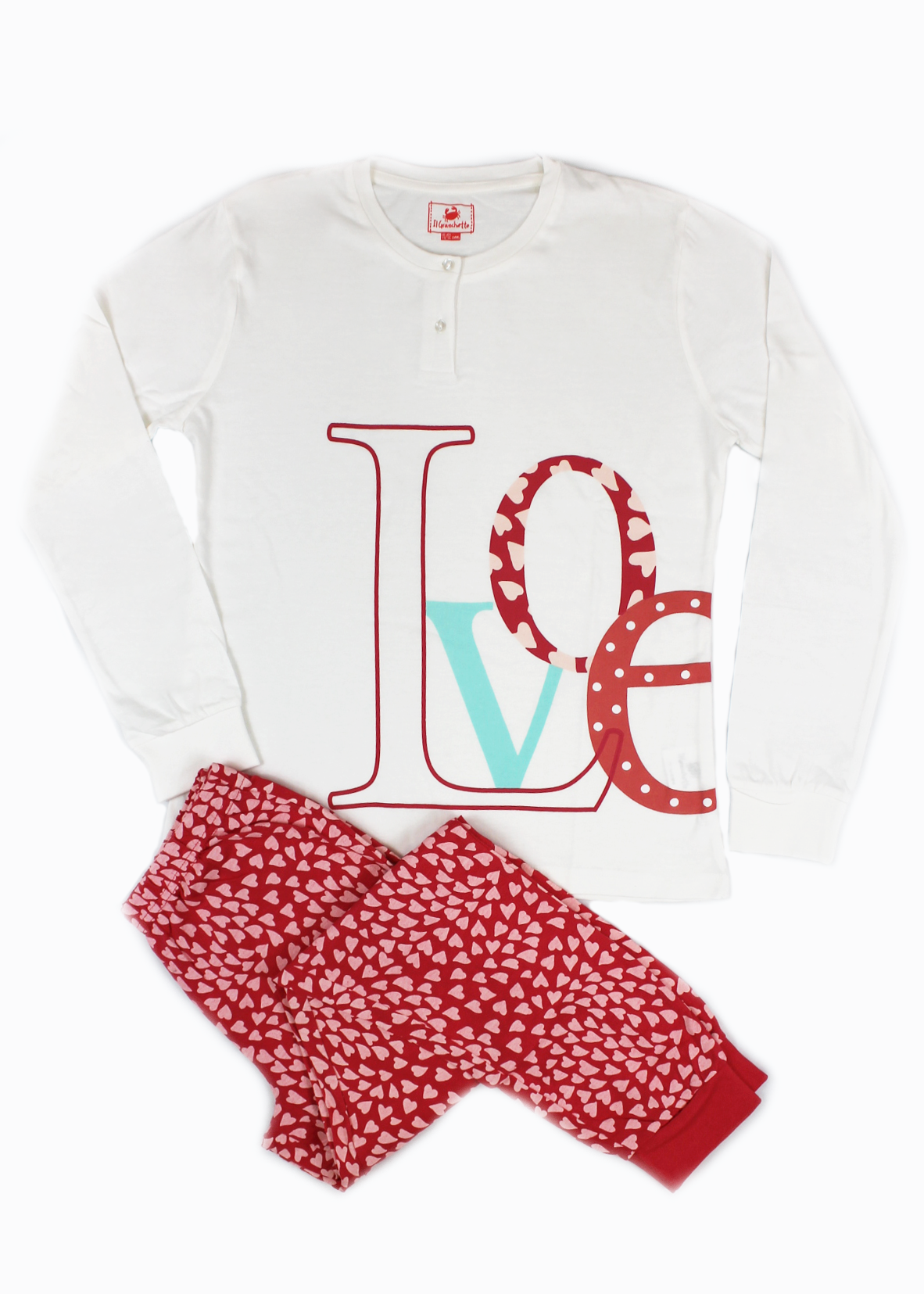 Composto da maglia girocollo con 2 bottoncini, manica lunga con bordo elastico al polso, decorata con scritta “Love” stampata e pantalone lungo a fantasia di cuori con bordo elastico alla caviglia.