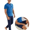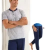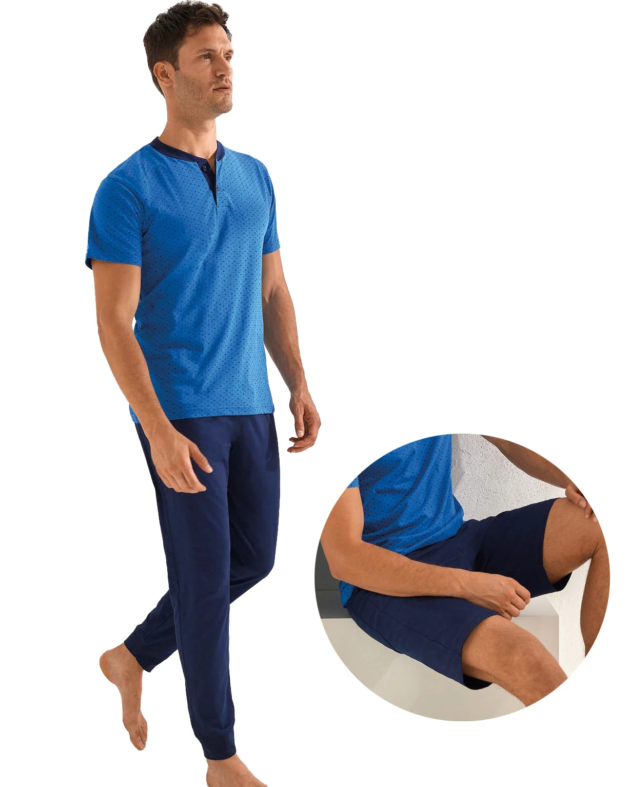 Composto da maglia girocollo modello serafino a mezza manica, bicolor; pantalone lungo tinta unita e tasca posteriore e pantalone corto a quadri con elastico in vita.