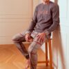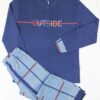 Composto da maglia girocollo con 2 bottoni e manica lunga con polsino nella stessa fantasia del pantalone e stampata con la scritta “Outside” e pantalone lungo stampato con linee incrociate con polsino alla caviglia.