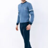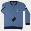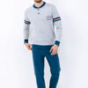 Colori disponibili: Oceano, Maglia con fondo oceano, stampa a rombi blu e bianco, bordo blu su girovita e polsi. Pantalone blu. Grigio Melange, Maglia con fondo grigio melange, stampa a rombi blu e carta zucchero, bordo blu su girovita e polsi. Pantalone blu.