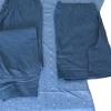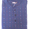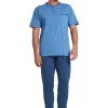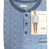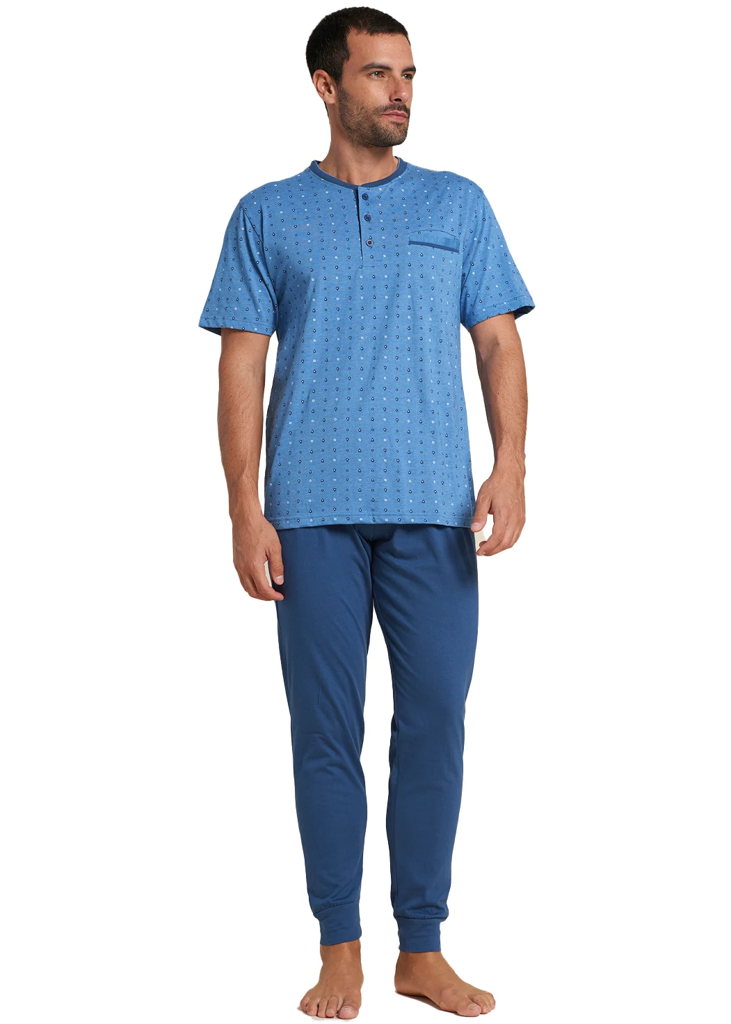 Composto da maglia girocollo modello serafino con tre bottoncini rifinito da bordura in tessuto, mezza manica, taschino laterale e decorazione a stampa e pantalone a tinta unita in due diverse lunghezze: lungo, con elastico polsino alla caviglia, e corto modello bermuda.