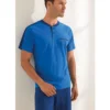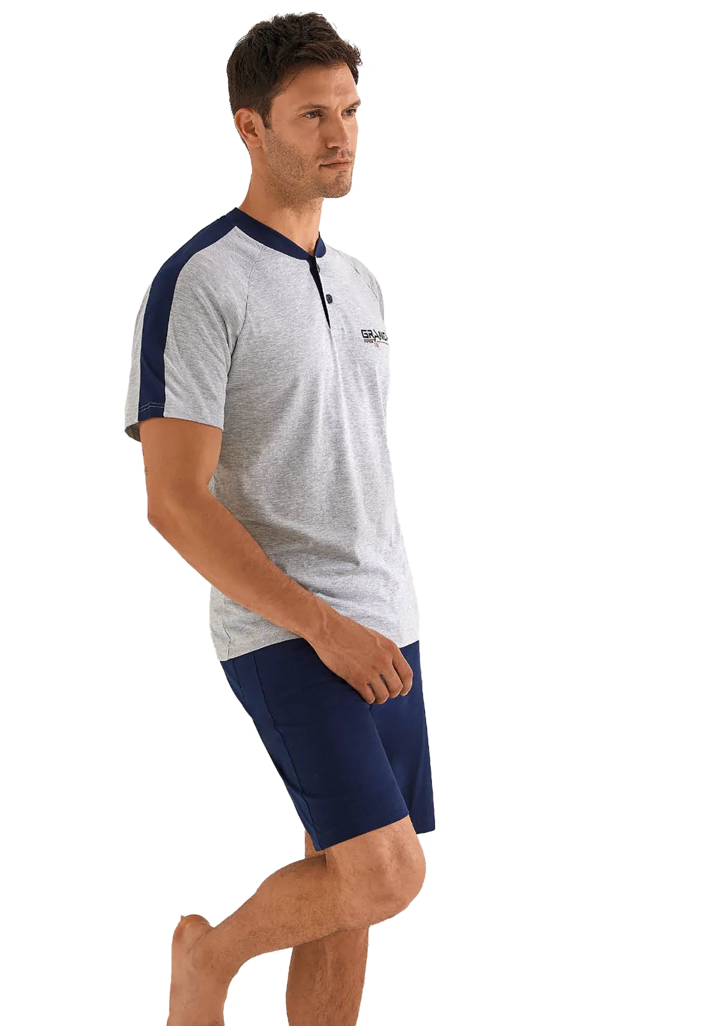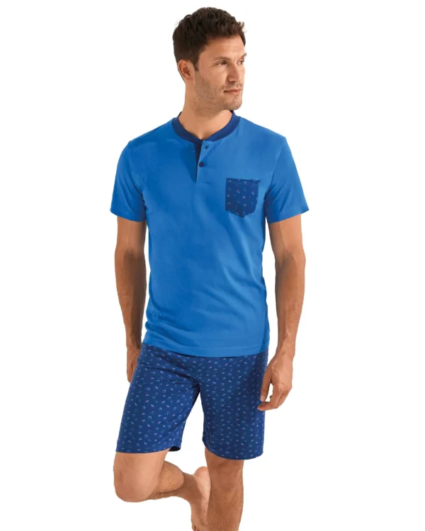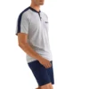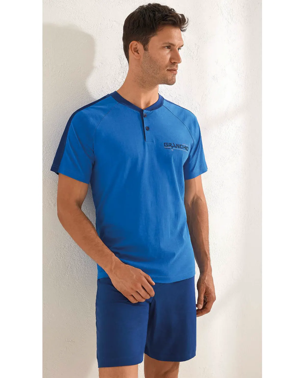 Composto da maglia dritta a girocollo modello serafino con 2 bottoncini in tinta unita e applicazione di strisce in tessuto sulla mezza manica; pantaloncino corto con un taschino posteriore.