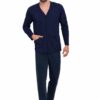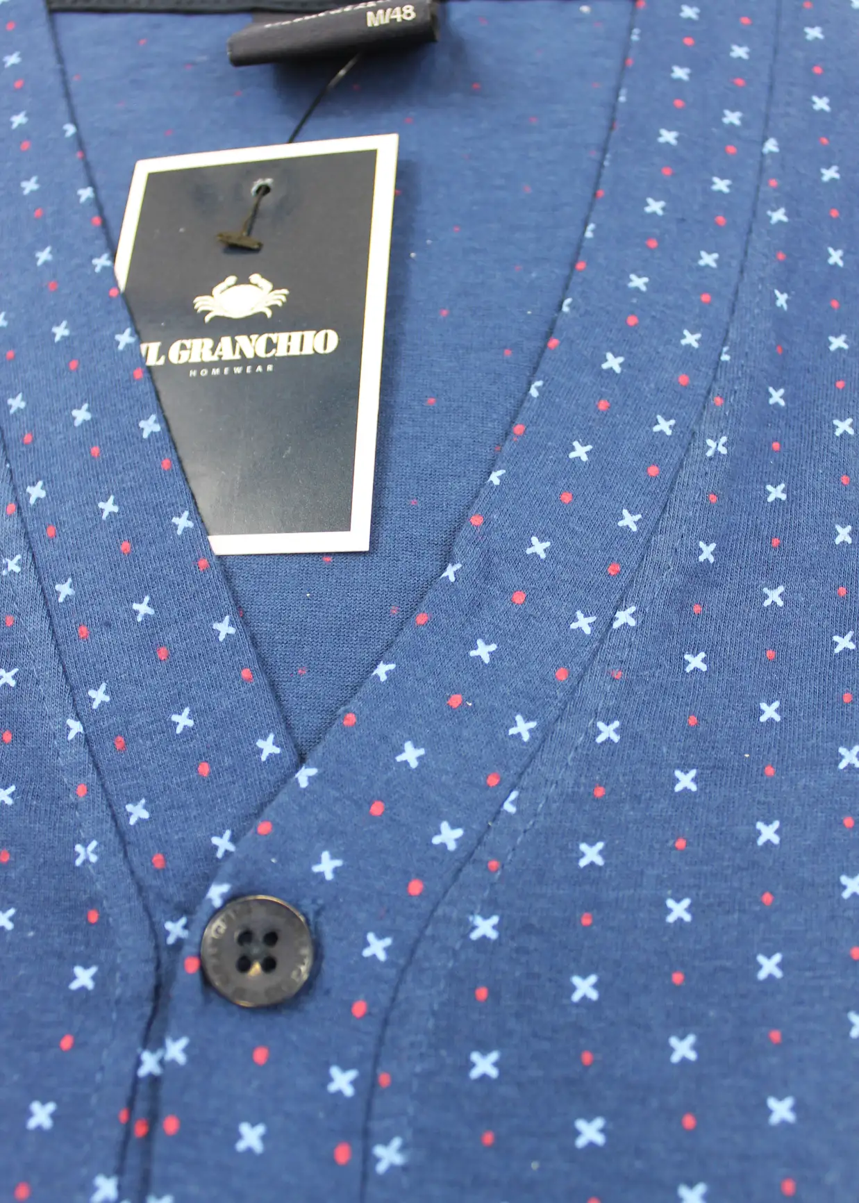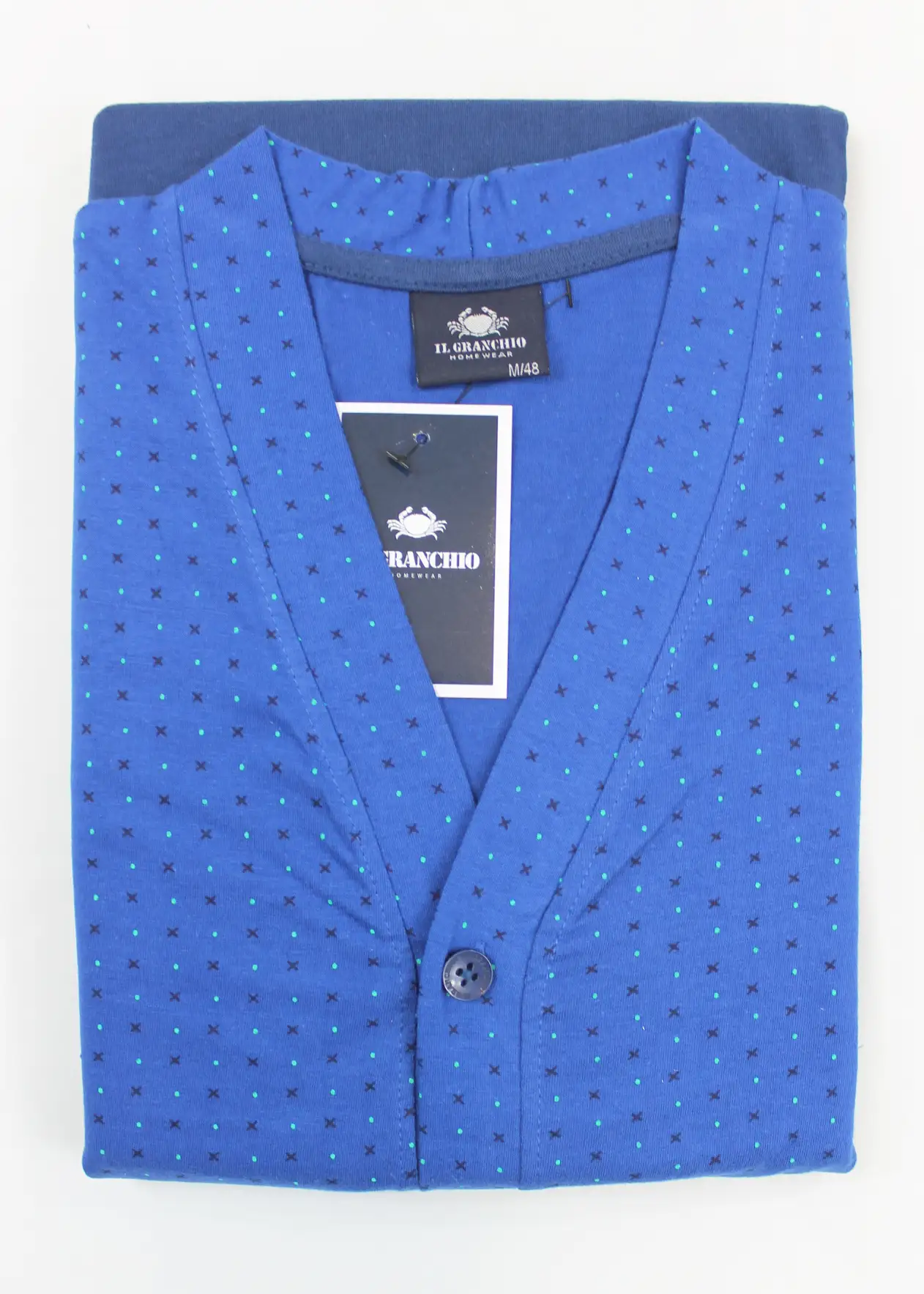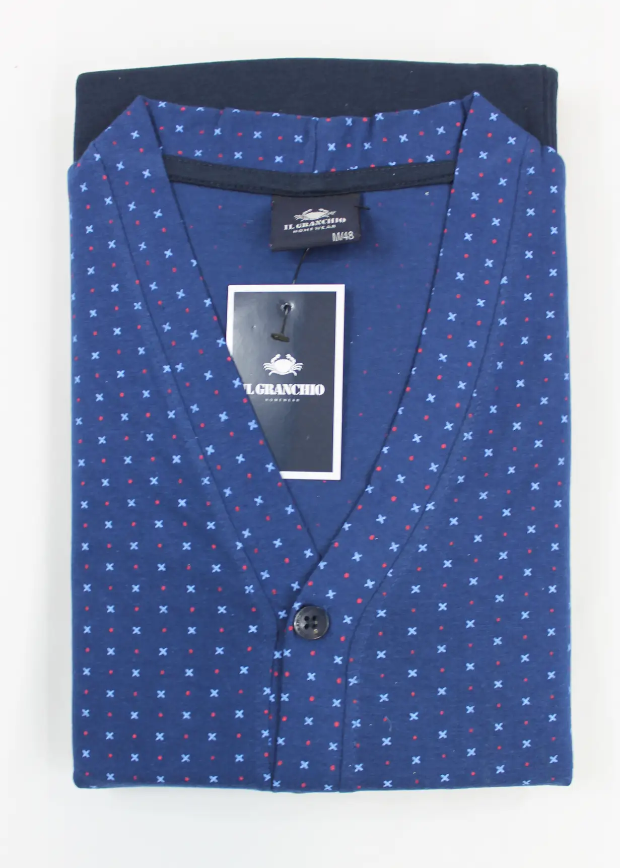 Composto da maglia con decorazione a stampa, scollo a V ed apertura su tutta la lunghezza chiusa da 5 bottoncini in tinta, tasche laterali e maniche lunghe e pantalone lungo a tinta unita.