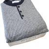 Dispone di colletto a giro con tre bottoncini di apertura e particolare motivo gessato della maglia realizzato in tinto filo.