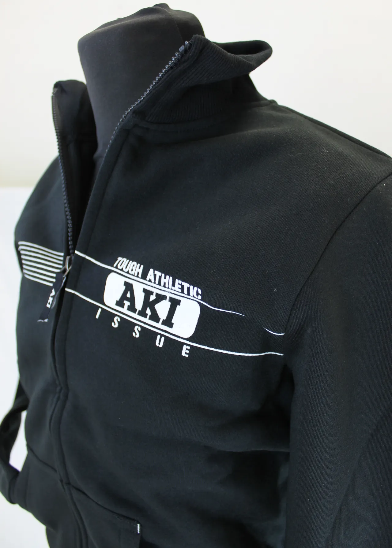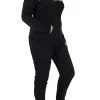 Il completo è composto da giacca a collo alto apribile con zip sull’intera lunghezza, maniche con polsini elasticizzati con trama a costine, tasche frontali ed elastico al fondo e pantalone lungo a tinta unita con banda elastica regolabile su girovita con coulisse e laccetto bianco regolabile, tasche laterali e polsini elasticizzati alla caviglia con trama a costine.