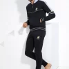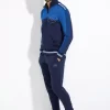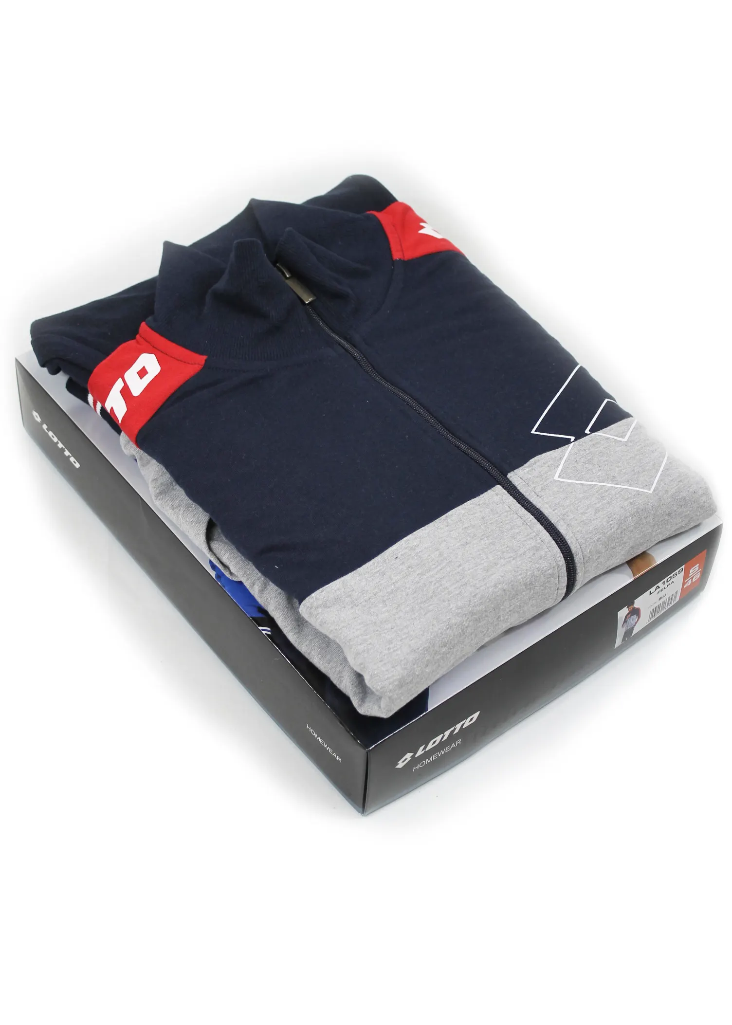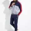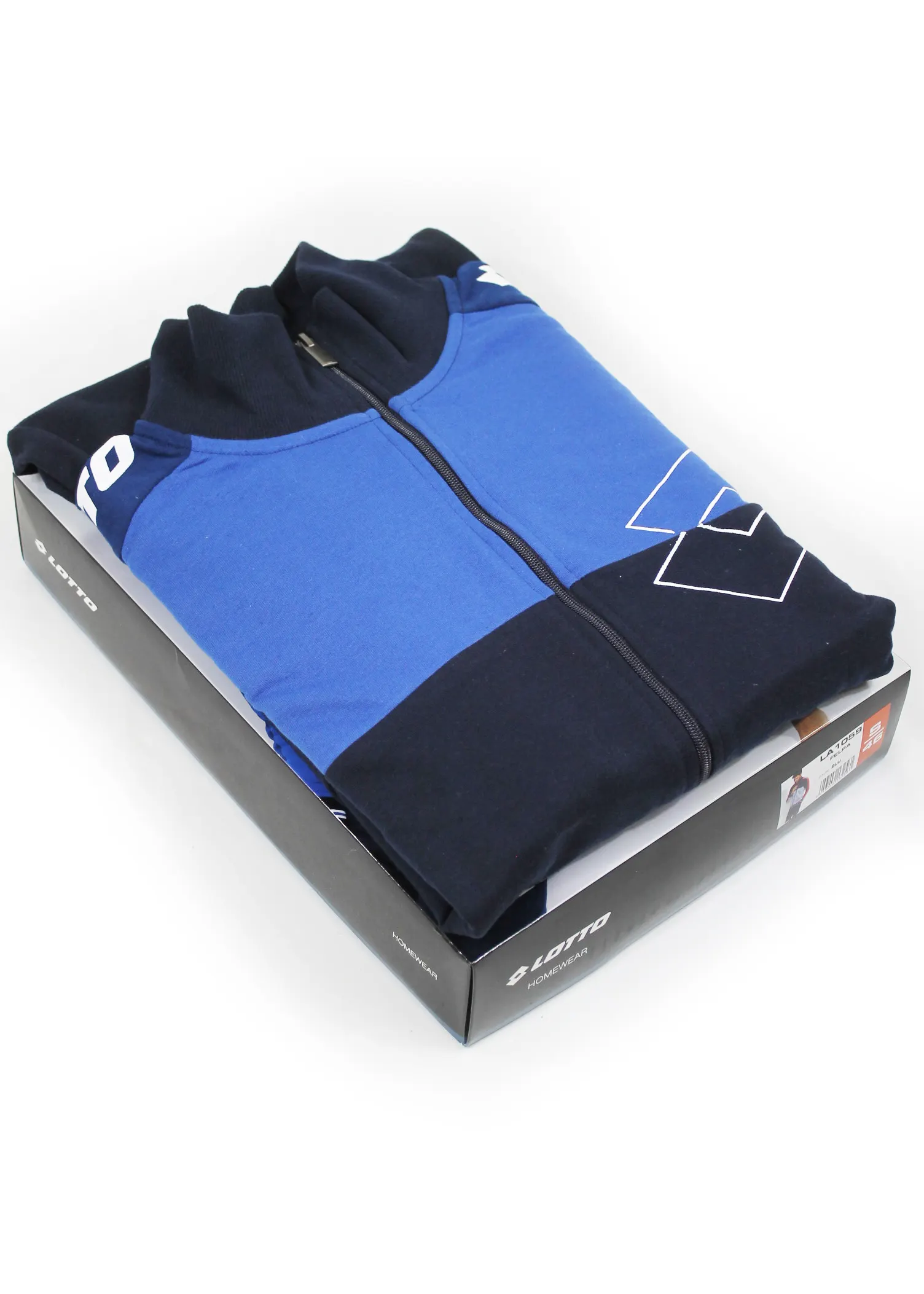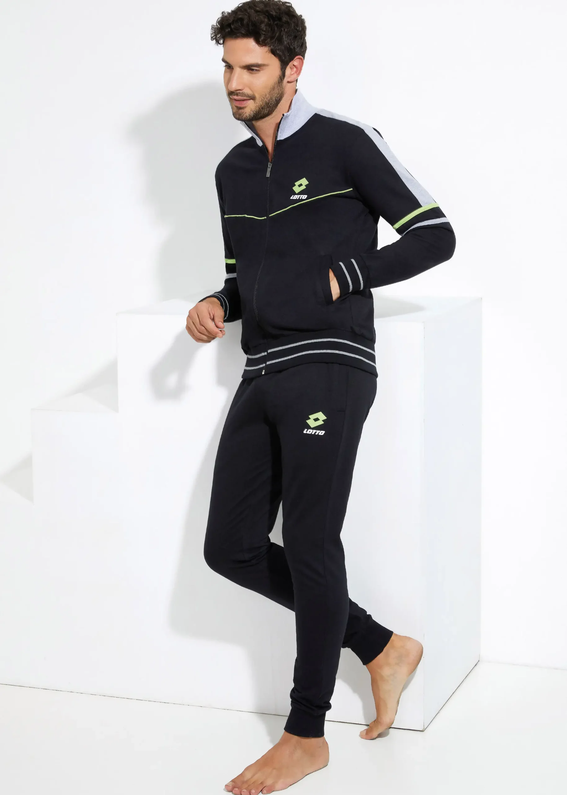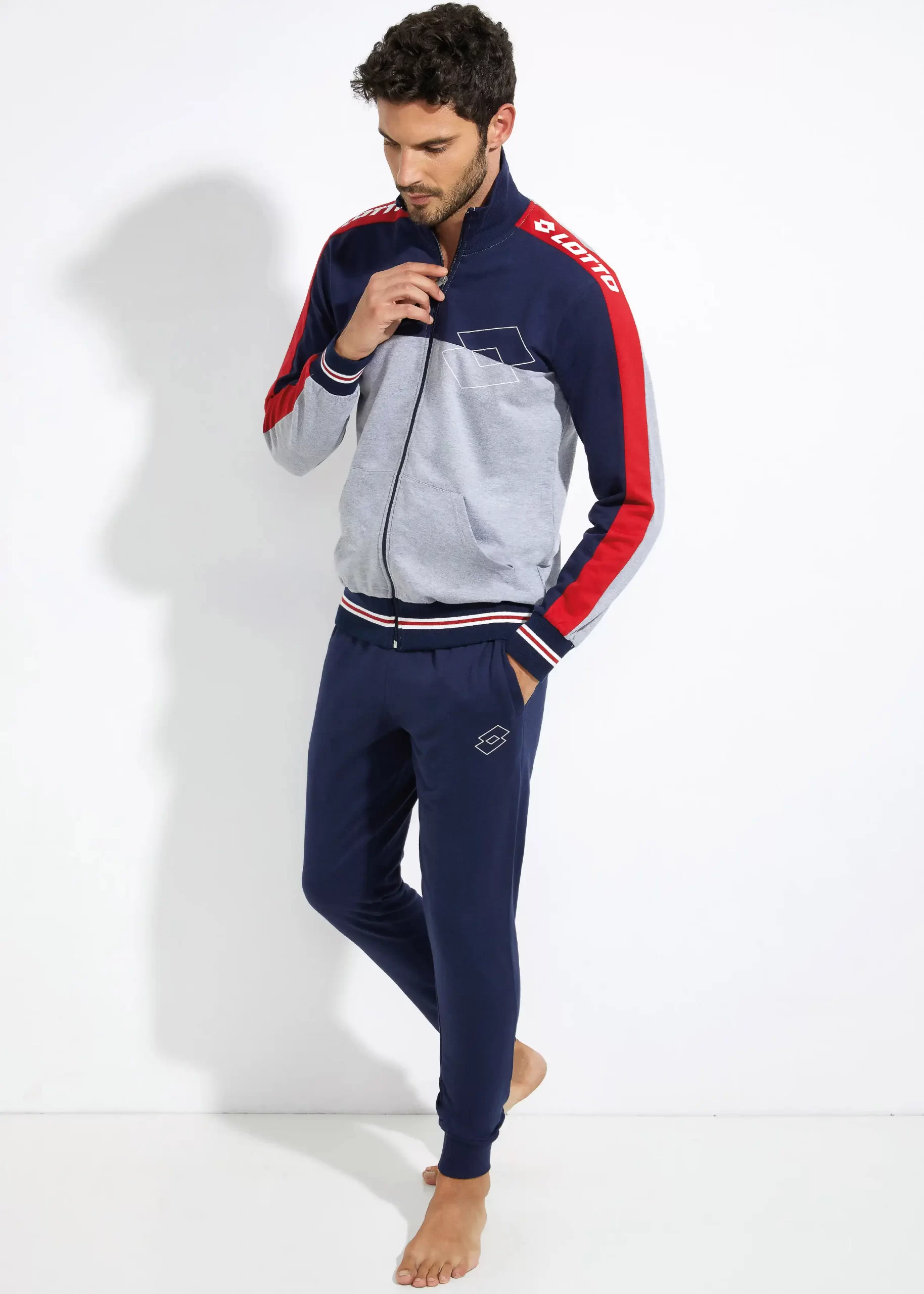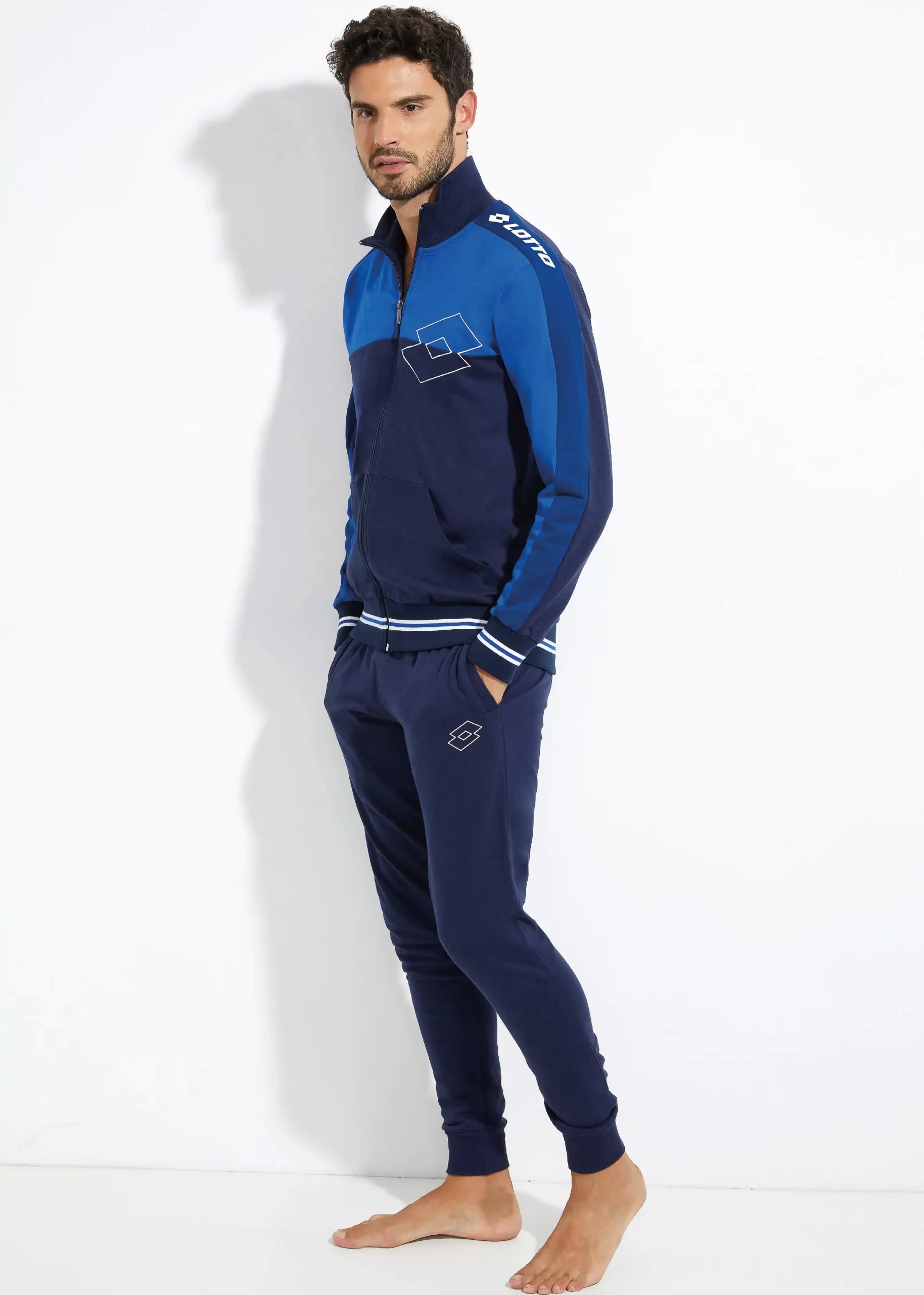 Giacchetto interamente apribile con comoda zip anteriore, polsini sulle maniche e colletto alto; cucita con tessuti di diverso colore applicati per avere un prodotto di alta qualità. Pantalone i tinta unita con tasche laterali, coulisse in vita e polsini sulle caviglie.